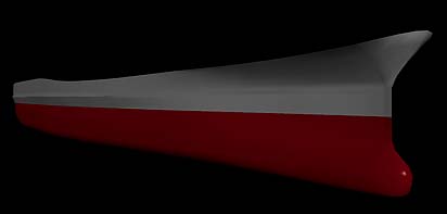 船の断面図にあたる、船体線図と側面図を模型雑誌や艦船図面から用意して、1〜20番まで(線形状に番号をつけておくと便利です)コピーを繰り返しながら片面を入力していきます。その際後の分割を考えてポイント数と箇所をきめます。「大和」の場合は、船体そのものがちょっとやっかいで艦底部・内火艇入口部・艦尾の搭載機出入口の3分割が必要です。また内火艇格納部のふくらみも追加しなければいけません。入力した線形状を側面図の同番号の数字に当てはめながら(但し同形状のものは省いてかまいません)自由曲線フォルダの中へ入れてやると船体ができます。ただ上の画像は艦底部との2分割しただけの状態を仮に張り合わせたもので後部は未完です。
